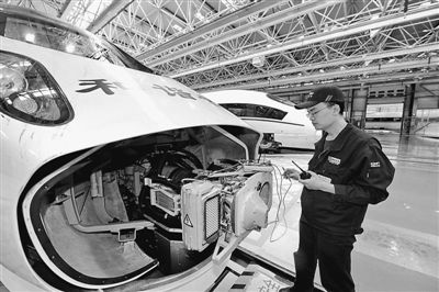 长春,北车长客高速动车组制造中心调试车间,调试工人刘天宇对车辆进行重联试验。