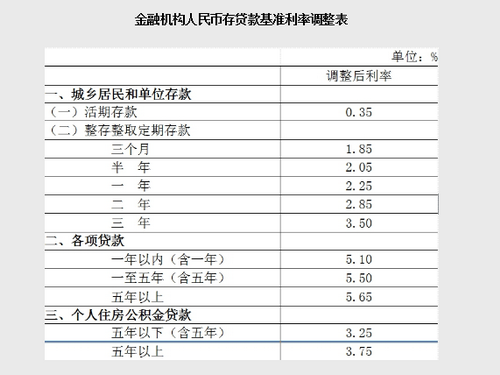 央行决定,自2015年5月11日起下调金融机构人民币贷款和存款基准利率。金融机构一年期贷款基准利率下调0.25个百分点至5.1%;一年期存款基准利率下调0.25个百分点至2.25%,同时结合推进利率市场化改革,将金融机构存款利率浮动区间的上限由存款基准利率的1.3倍调整为1.5倍;其他各档次贷款及存款基准利率、个人住房公积金存贷款利率相应调整。
